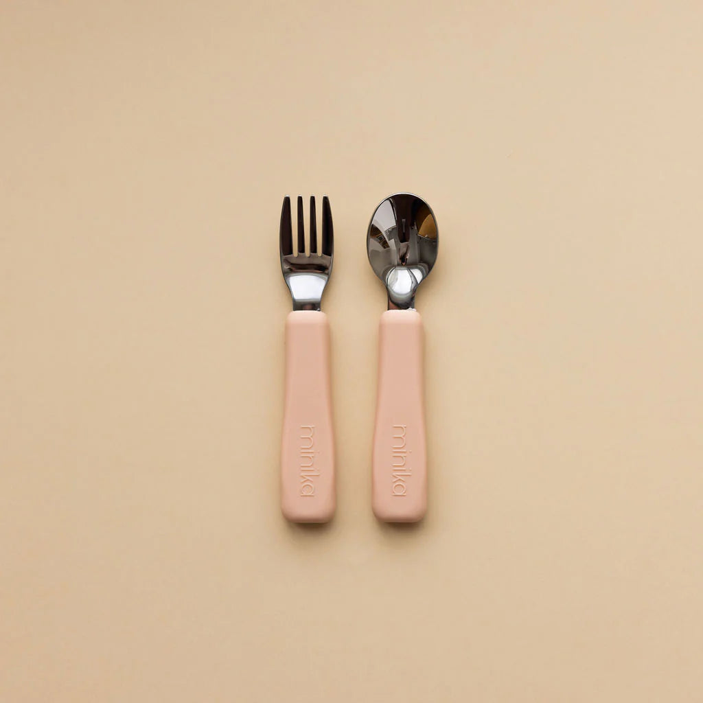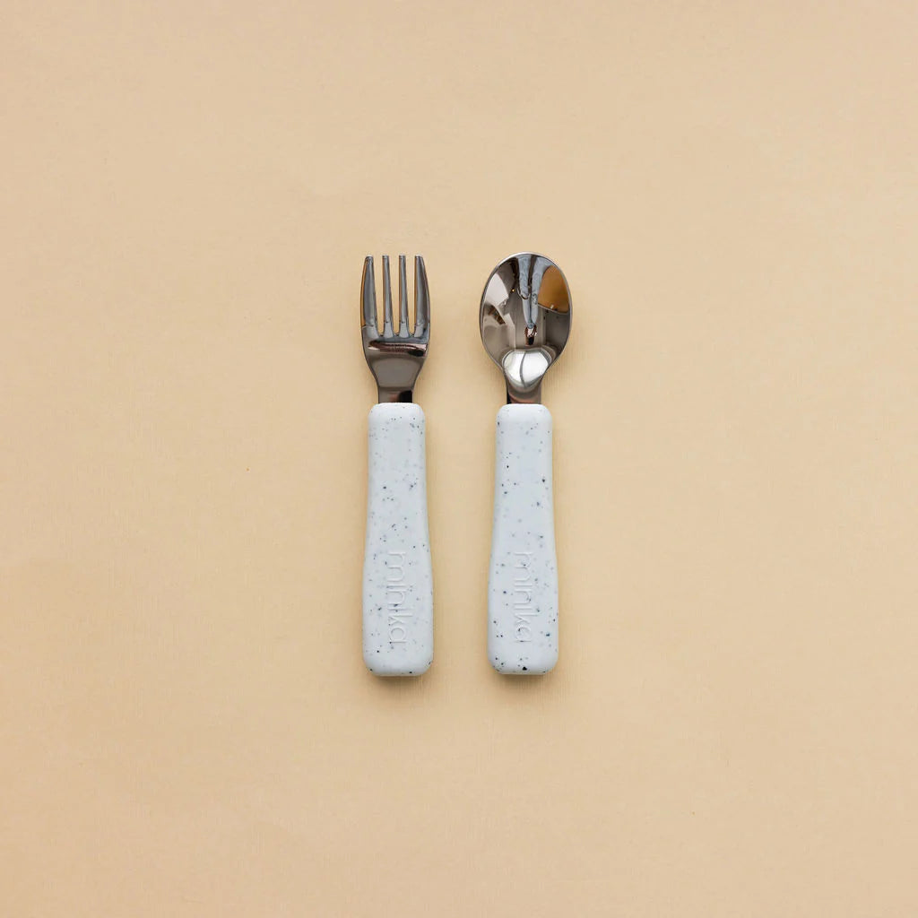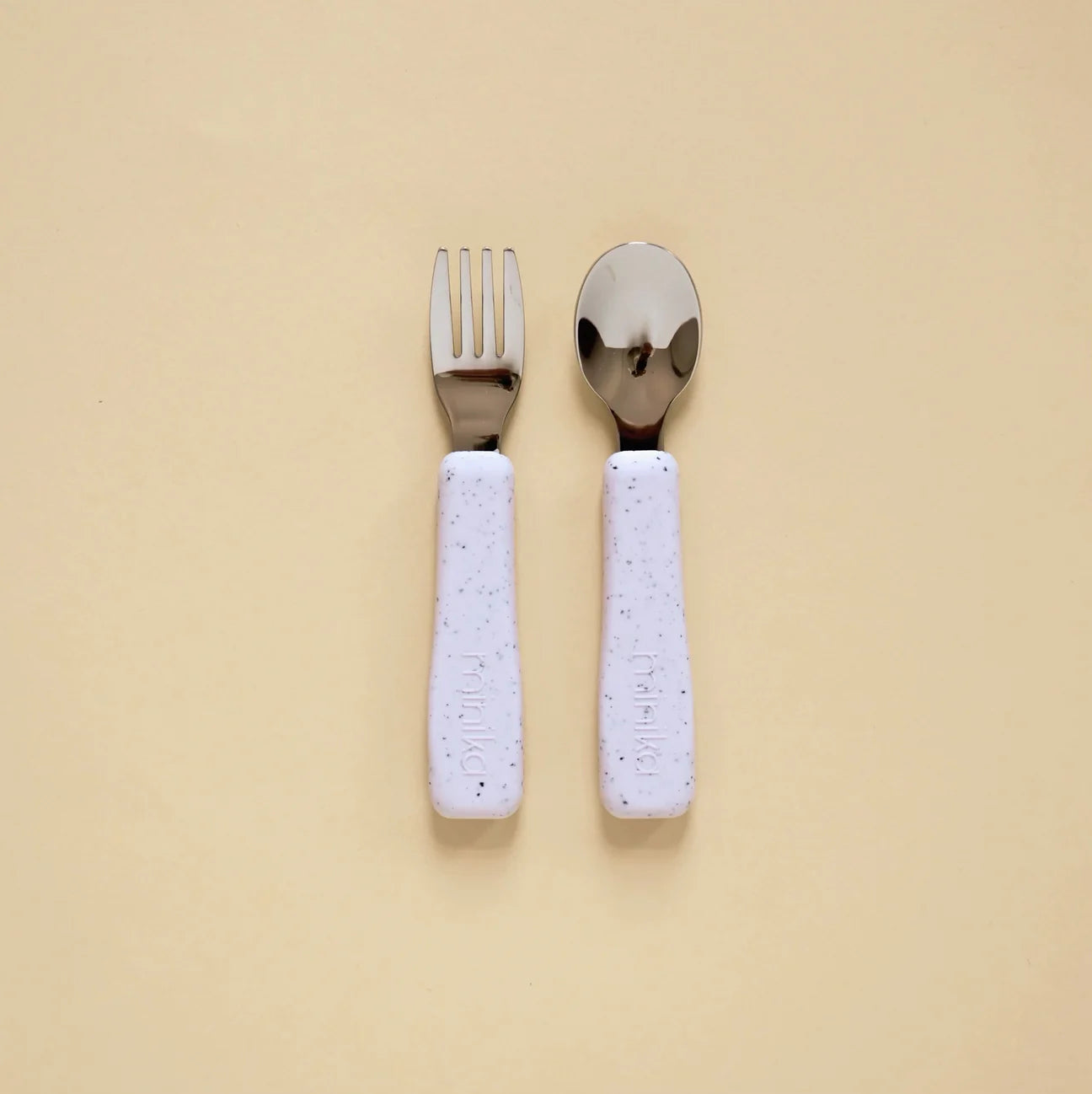 Ensemble de fourchette et cuillère avec poignée en silicone. Silicone alimentaire sans BPA, PVC, phtalates et sans plomb. Laver avec du savon et un chiffon mouillé ou au lave-vaisselle. Acier inoxydable. Poignée en silicone anti-dérapante.