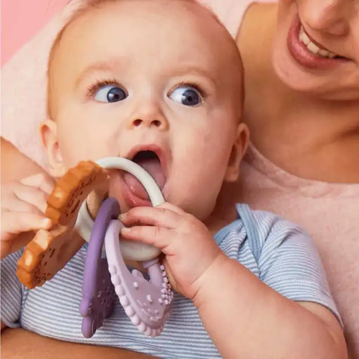 Trois anneaux de dentition montés sur un anneau pratique aux textures variées massent doucement les gencives douloureuses.