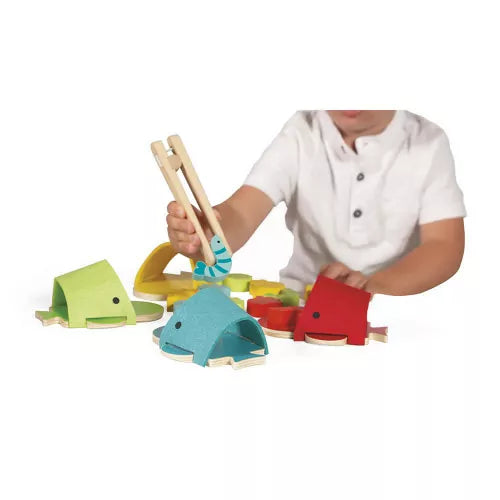Baleines colorées cherchent festin pour se régaler ! Avec ce jeu de tri des couleurs, les enfants à partir de 2 ans vont pouvoir se familiariser avec les couleurs tout en développant leur motricité fine ! A l'aide de la pince en bois, on attrape les petits animaux marins (12 en tout) et on les place dans la bouche de la baleine de la couleur correspondante. Un jeu en bois ludique et éducatif où poissons et crevettes tiendrons compagnie aux petits ! La manipulation de la pince favorise le développement de la motricité fine, il va falloir faire preuve de dextérité pour mettre les animaux au bon endroit ! Un jouet d'éveil en bois issu de forêts gérées durablement, certifiées FSC®.